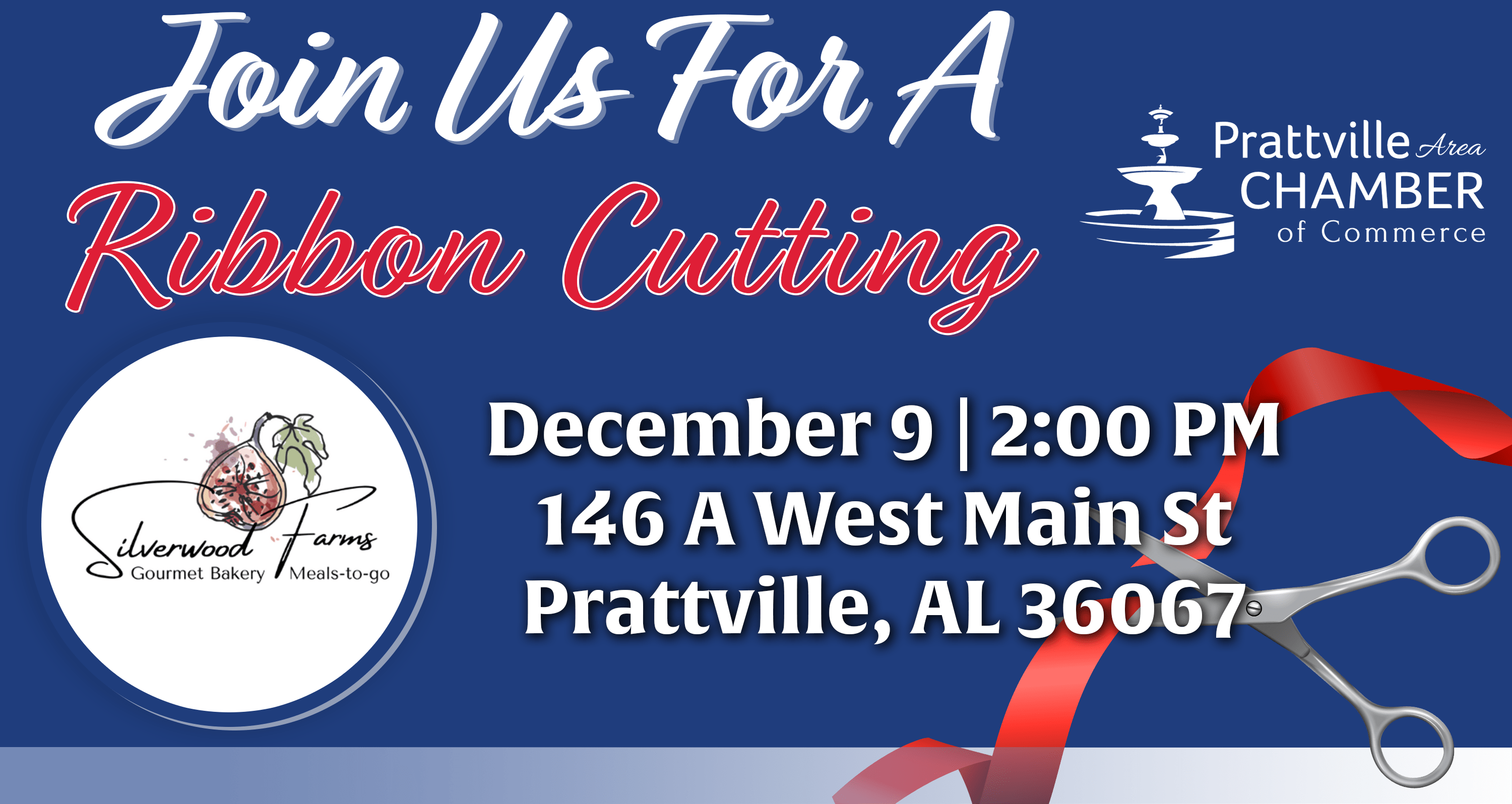 We hope to see you December 9th at 2:00 PM to help us officially cut the ribbon for Silverwood Farms at 146 A West Main St in Downtown Prattville. Ribbon cuttings are celebrations, while also showing that Prattville and Autauga County are open for business. For more information, please contact the Prattville Area Chamber of Commerce at 334.365.7392. We hope to see you there!