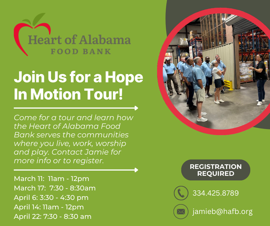 Have you ever wondered how the Heart of Alabama Food Bank serves over 8.970 food insecure children, adults and seniors across Autauga County? Join Jamie Brown, Director of Corporate and Community Partnerships, for a Brew and View (coffee), Bites and Insights (lunch) or After Hours for Hope (refreshments) tour to learn about how the Heart of Alabama Food Bank serves our communities. Registration Required: https://form.jotform.com/251886197412162